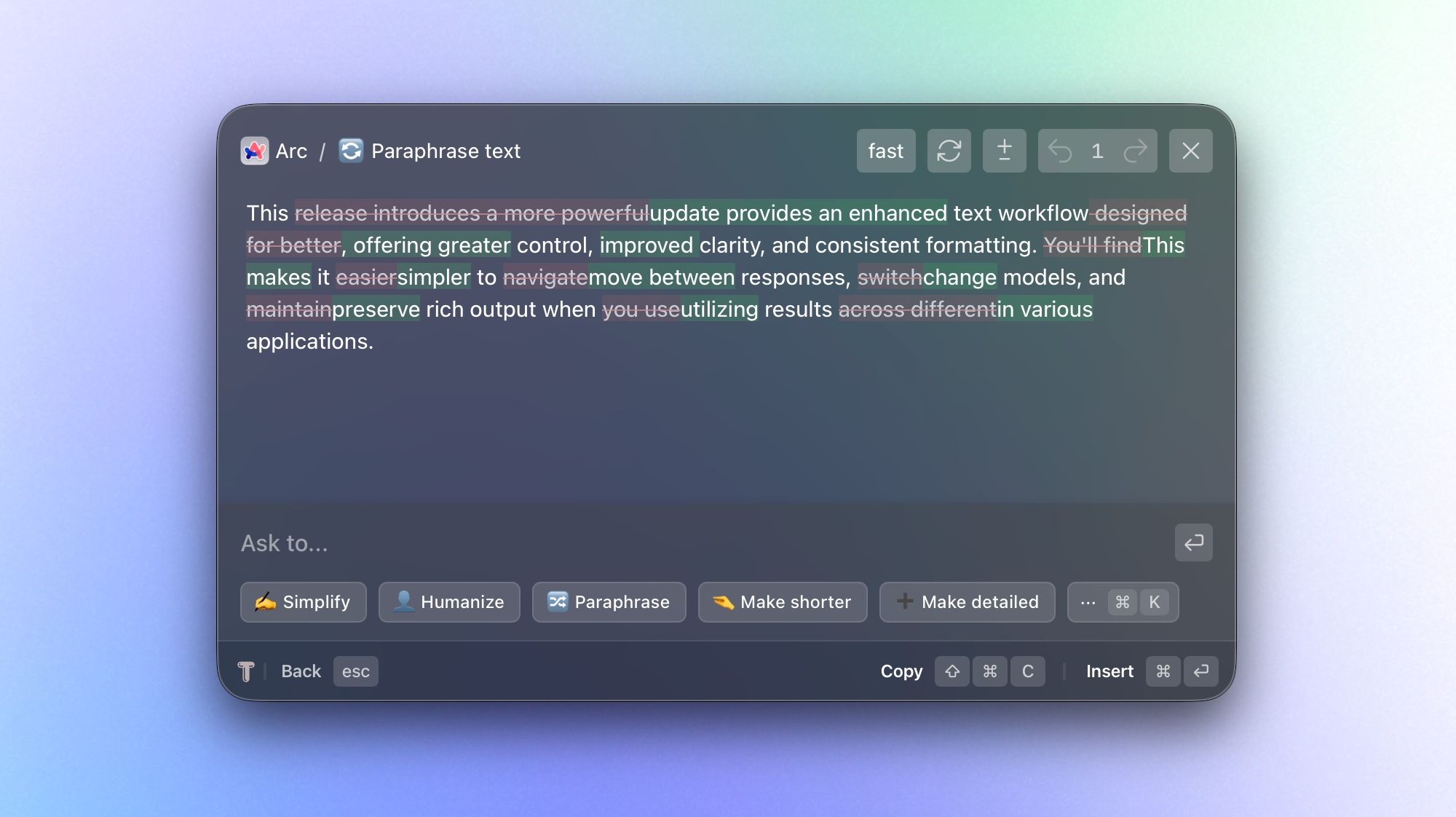 This update improves your text workflow by letting you compare changes and preserve original formatting when you use results across different apps. You'll also find it easier to navigate between responses with a focus on results, changing models, and retrying responses right within chat.